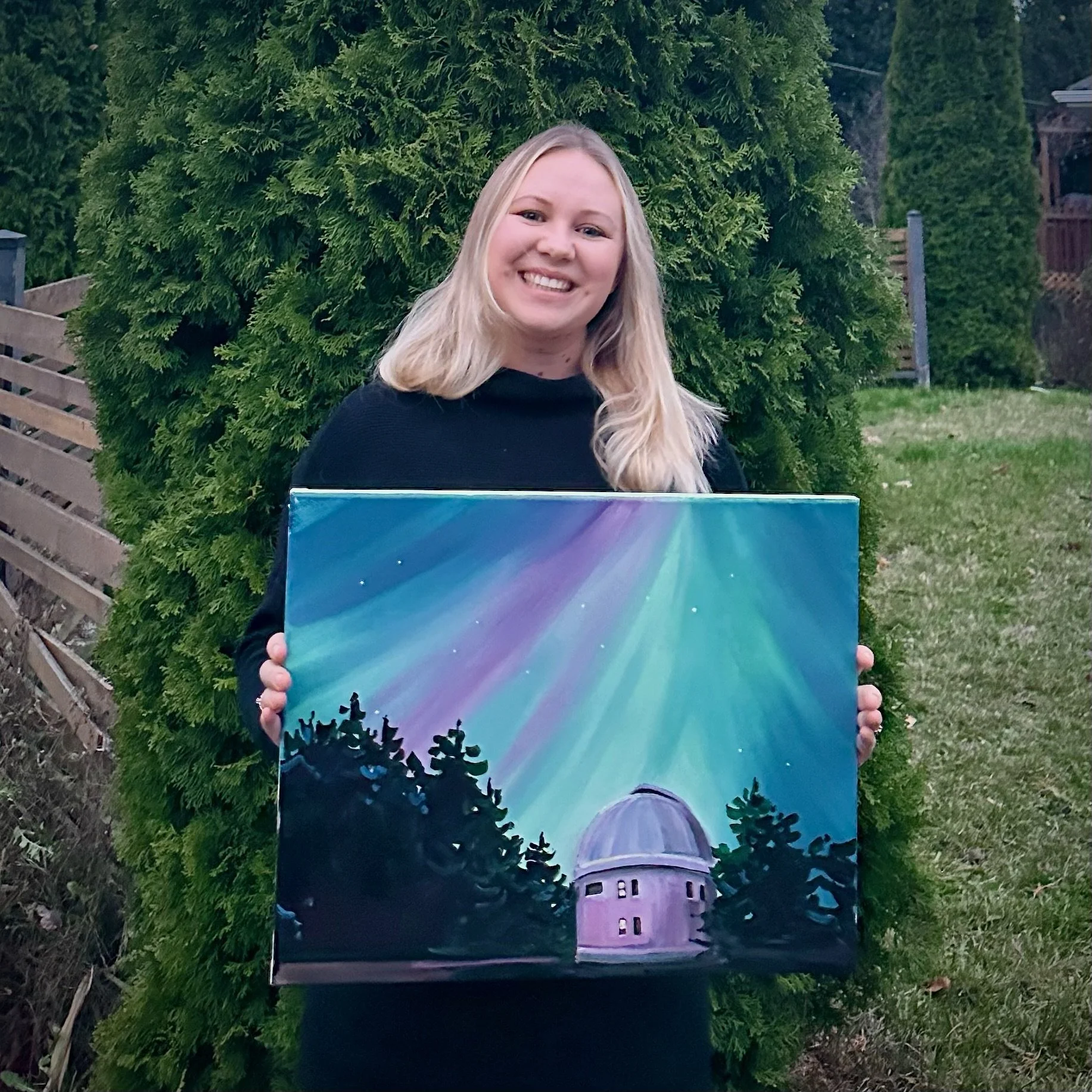 Leah displays a painted version of the May 2024 Aurora, original by Aimee Rawson.